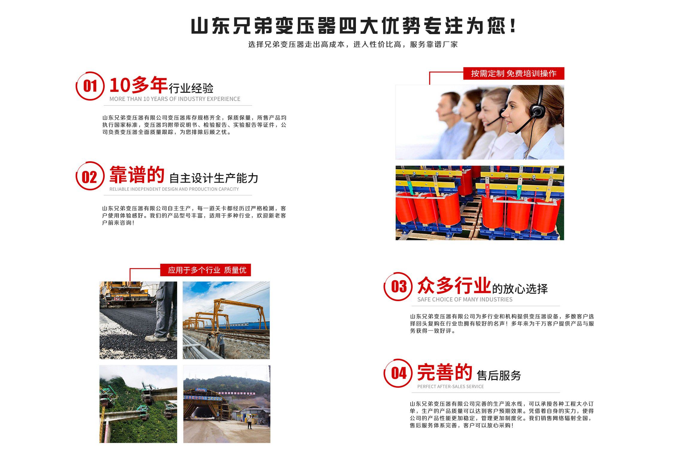 山東兄弟變壓器有限公司經營SCB10干式變壓器,SCB11干式變壓器價格,SCB12變壓器,SCB13干式變壓器,SCB14干式變壓器,SCB18干式變壓器等產品及用戶要求的特殊變壓器。 公司的質量方針是:“顧客的滿意,是我公司的追求。”堅持質量,用戶至上,以質興業,以優取勝,愿為廣大用戶設計各種要求的變壓器,以求共同發展。 企業精神:“創新、求實、誠信、高效”。 企業作風:“嚴、細、實、快”。 企業工作方針:“加強內部管理,夯實基礎,全面提高職工整體素質,使企業管理水平再上新的臺階”。 公...